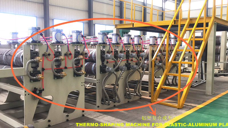 青島東方之星的一套完整的PE鋁塑板生產線由SJ150×33單螺桿擠出機、復合模頭、三輥壓光機、雙面鋁卷放料架、雙輥熱復合機、八輥熱復合機、六輥冷卻導輥架、覆膜機、四輥牽引機和切割機等設備組成,通過PLC系統(tǒng)實現(xiàn)整線智能化控制。